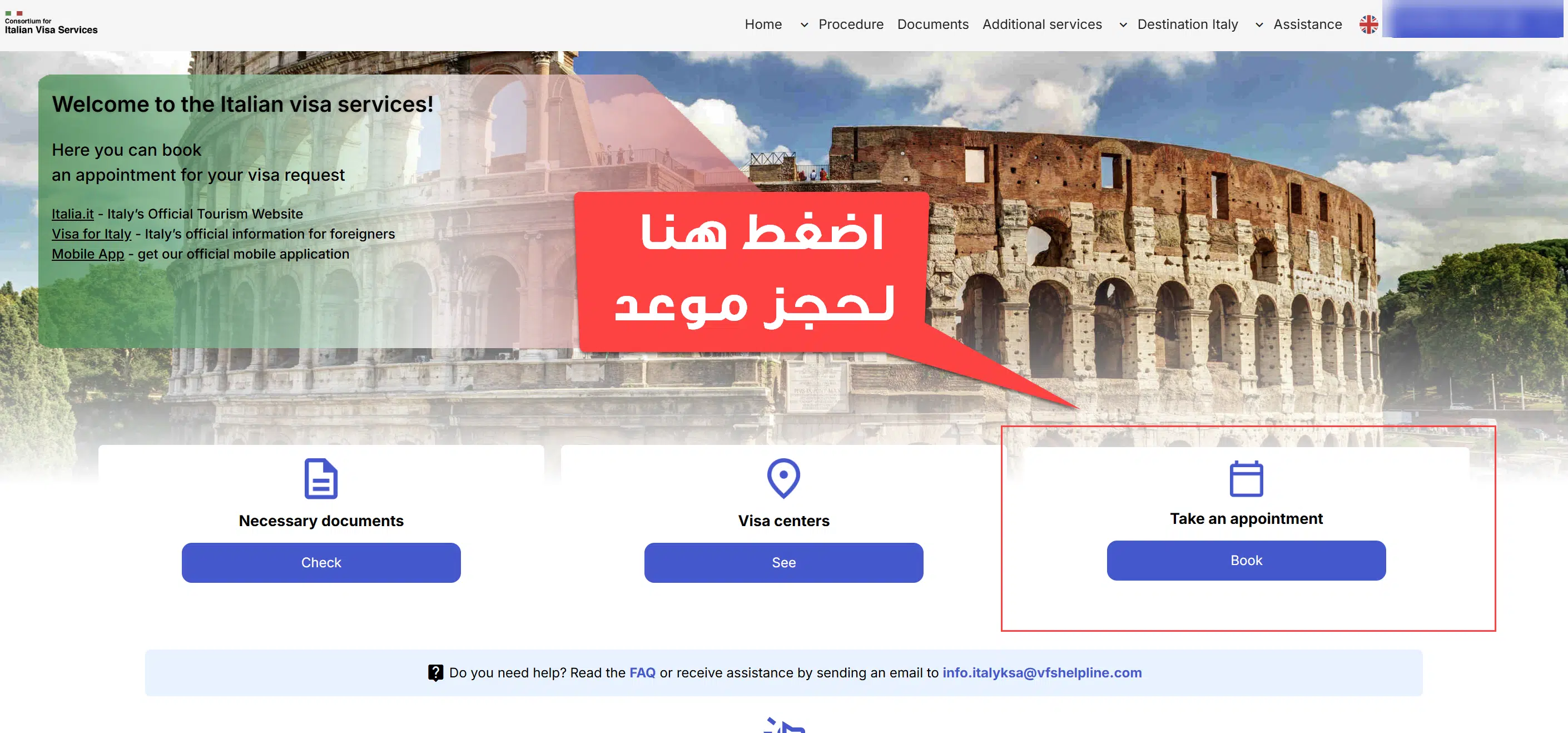 - كيف احجز موعد VFS لايطاليا؟ عبر موقع ksa.consortiumforitalianvisaservices.com/appointment ثم اختيار المدينة وتاريخ الرحلة ووجهتك الاولى داخل ايطاليا.